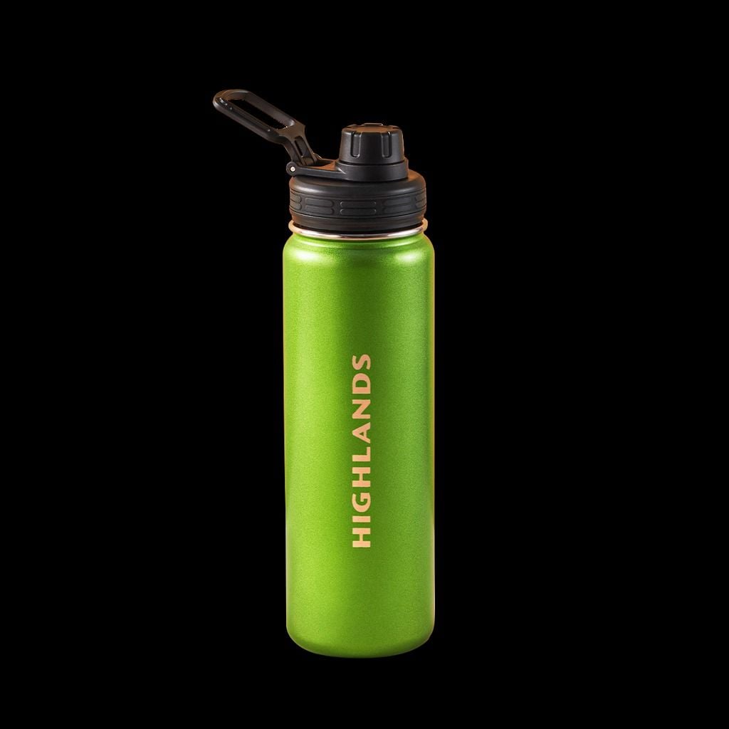 - Logo độc đáo: Chữ "HIGHLANDS" được in màu vàng đồng theo chiều dọc thân bình. Cách bố trí logo này không chỉ tạo cảm giác hiện đại, khác biệt mà còn rất nổi bật trên nền xanh lá, khẳng định giá trị thương hiệu một cách đầy phong cách.