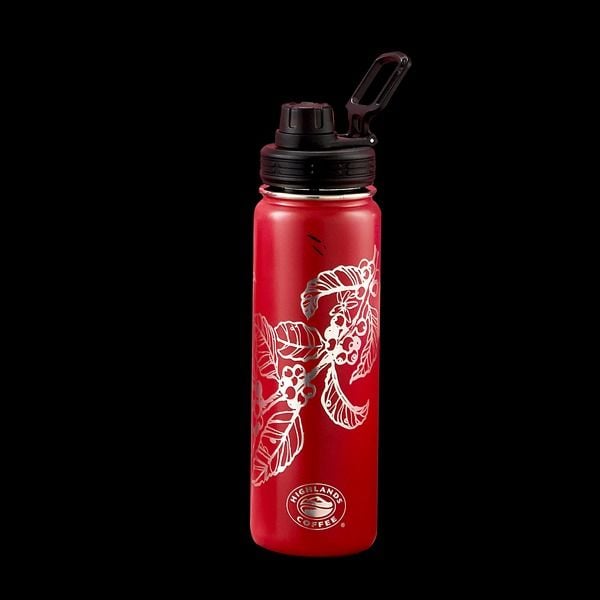 - Màu sắc và họa tiết: Thân bình sở hữu một màu đỏ rực rỡ và đầy năng lượng, được phủ một lớp sơn cao cấp. Điểm nhấn đắt giá và nghệ thuật nhất chính là cụm họa tiết cành lá và quả cà phê được phác họa tinh xảo bằng các đường nét màu bạc hoặc trắng. Họa tiết này uốn lượn mềm mại quanh thân bình, không chỉ làm đẹp mà còn kể câu chuyện về nguồn gốc và tinh hoa của những hạt cà phê. Logo "HIGHLANDS COFFEE" được đặt khéo léo ở phần dưới của cụm họa tiết, tạo nên một tổng thể thiết kế thống nhất và đầy tính kể chuyện.