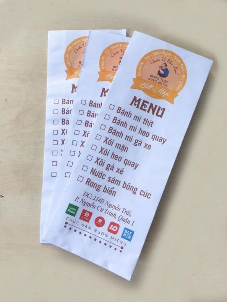 Túi giấy trắng in logo tròn và menu quán, mang lại sự sang trọng tinh tế.