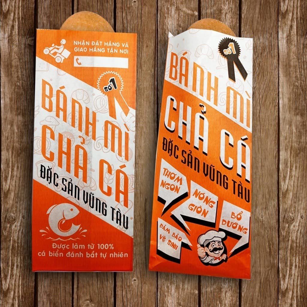 Túi giấy trắng in họa tiết màu cam nổi bật, giúp thương hiệu tiệm bánh mì dễ nhớ.