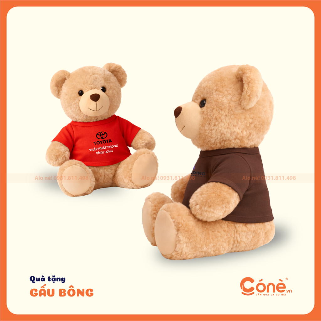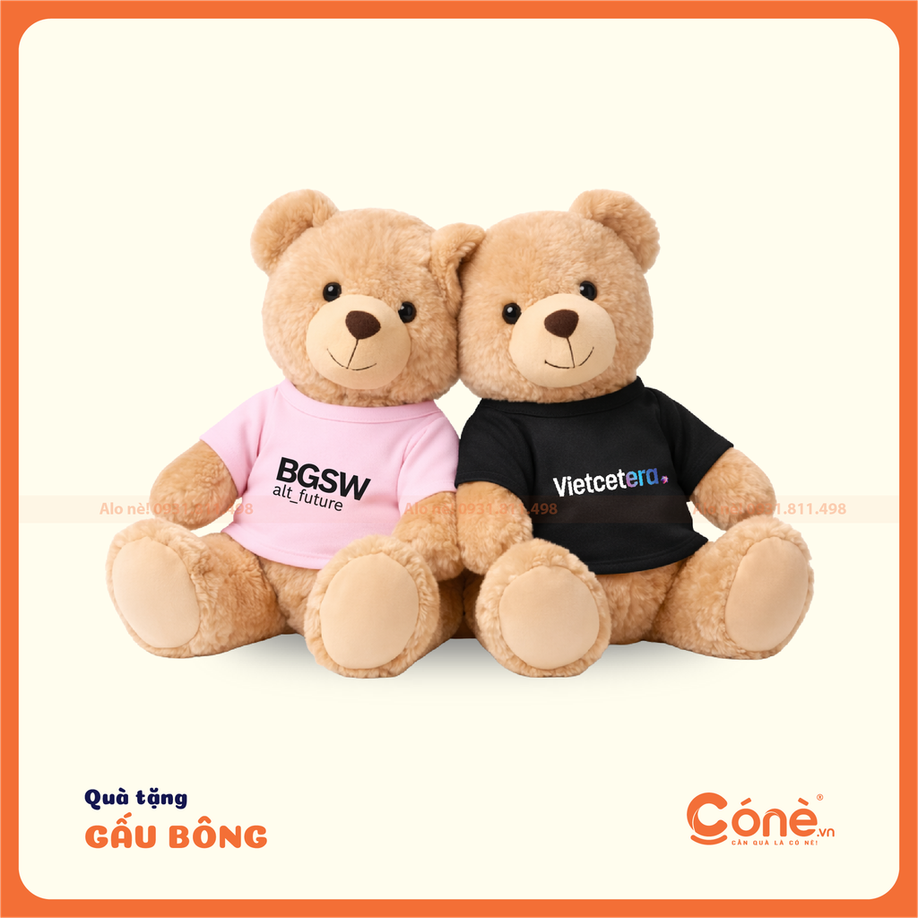 - Công nghệ in logo sắc nét, sống động: Chúng tôi sử dụng công nghệ in hiện đại để đảm bảo logo và slogan của bạn được thể hiện chuẩn xác, màu sắc tươi tắn và bền bỉ trên áo của gấu bông. Hình ảnh thương hiệu của bạn sẽ luôn chuyên nghiệp và rõ nét trong mắt người nhận.