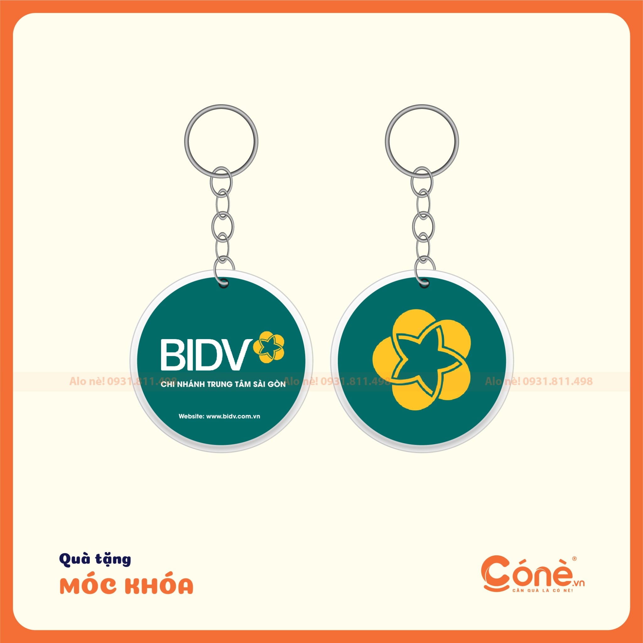 Móc khoá của ngân hàng BIDV. Có Nè đã thiết kế móc khoá hình tròn, chất liệu mica, in logo và tên chi nhánh nổi bật giữa nền sản phẩm